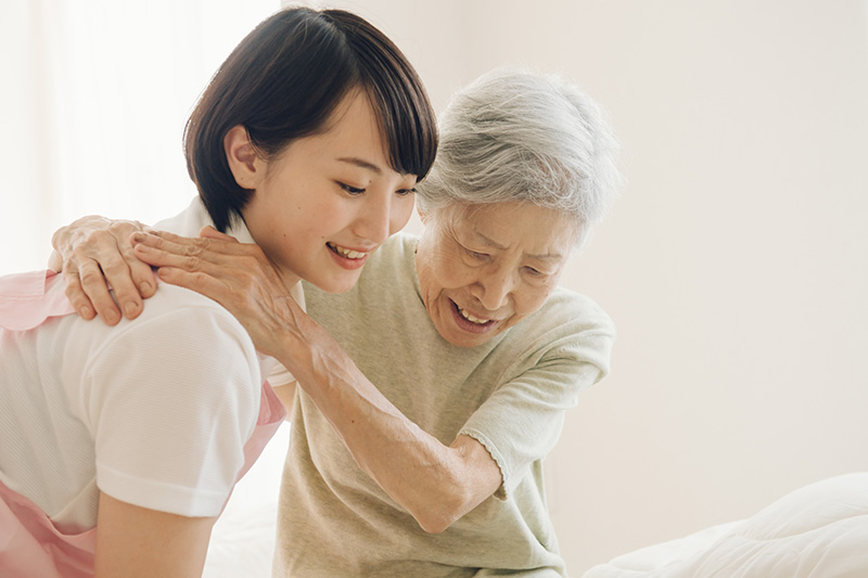 ベッドから車いすへの移動や、寝返りのサポートなど、身体への負担を減らすよう工夫しています。